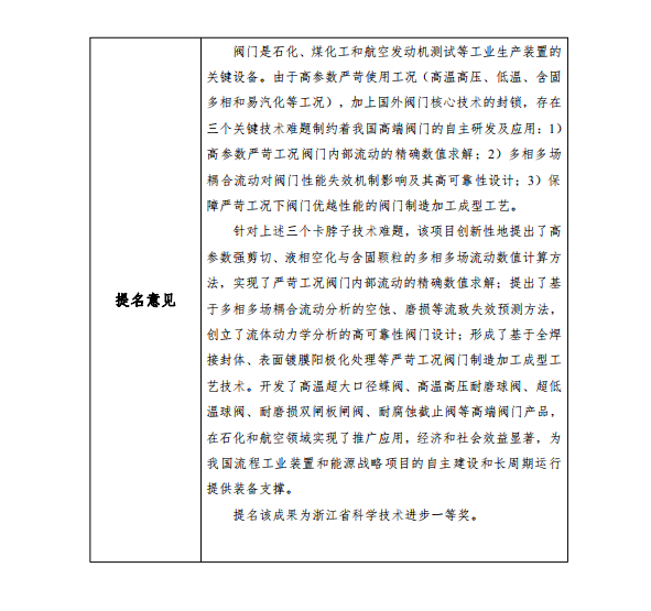 根據《浙江省科學技術廳關于開展2021年度浙江省科學技術獎提名工作的通知》要求,現對我單位擬參與申報的浙江省科技獎勵項目“嚴苛工況閥門關鍵技術及應用”予以公示,公示期7天(2022年2月26日至2022年3月4日)。